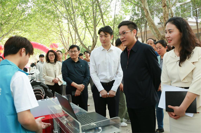 活動(dòng)期間,校黨委書記厲勵(lì),黨委副書記、紀(jì)委書記田華,副校長(zhǎng)任楓軒與宣傳部、團(tuán)委、學(xué)工部、教務(wù)處、科技開發(fā)處、創(chuàng)業(yè)學(xué)院等部門負(fù)責(zé)人一起參加現(xiàn)場(chǎng)巡展,并在“我們的河職我代言,爭(zhēng)做文明河職人 ”簽名墻上簽下自己的姓名,倡議全體師生從我做起,從身邊做起,從點(diǎn)滴做起,爭(zhēng)做文明河職人,攜手共建文明校園。隨后,厲勵(lì)一行走到每個(gè)展臺(tái)前與參展同學(xué)進(jìn)行親切交流,他希望廣大團(tuán)員青年一要堅(jiān)守愛黨初心,將個(gè)人的理想追求融入黨和人民的事業(yè)之中,感黨恩,聽黨話,跟黨走,切實(shí)擔(dān)負(fù)起黨和人民賦予的歷史重任,爭(zhēng)做有理想、敢擔(dān)當(dāng)、能吃苦、肯奮斗的時(shí)代新人;二要擦亮愛國(guó)主義鮮亮底色,將激昂的青春夢(mèng)想融入偉大的中國(guó)夢(mèng)中,將小我融入大我,以行動(dòng)詮釋愛國(guó)之情,用青春書寫報(bào)國(guó)之志,爭(zhēng)做德技并修的能工巧匠、大國(guó)工匠;三要牢樹“愛校榮校,為校爭(zhēng)光”理念,增強(qiáng)主人翁意識(shí),為學(xué)校建設(shè)發(fā)展建言獻(xiàn)策,貢獻(xiàn)智慧和力量,在創(chuàng)新創(chuàng)業(yè)中增長(zhǎng)才干、銳意創(chuàng)新、敢試敢闖、不懼挑戰(zhàn),在“挑戰(zhàn)杯”的舞臺(tái)上展現(xiàn)青春風(fēng)采,爭(zhēng)做開拓新領(lǐng)域的先鋒,創(chuàng)造新業(yè)態(tài)的先鋒,探索新模式的先鋒,讓創(chuàng)新成為青春遠(yuǎn)航的動(dòng)力,讓創(chuàng)業(yè)成為青春搏擊的能量,讓青春年華在為國(guó)家、為人民的奉獻(xiàn)中煥發(fā)出絢麗光彩。