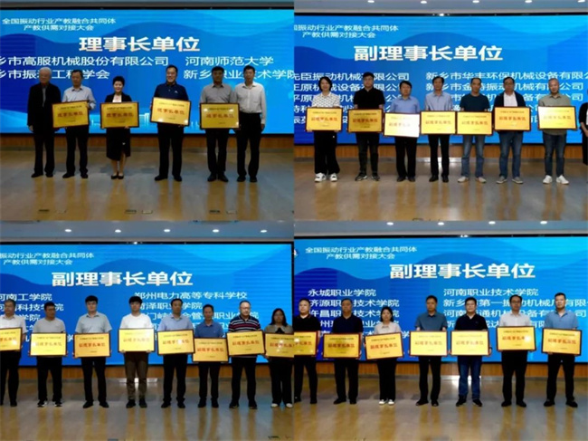 會上,全體會員單位舉手表決通過《全國振動行業(yè)產(chǎn)教融合共同體章程(討論稿)》、共同體理事長單位、副理事長單位、理事單位、秘書長單位等名單。出席會議的領導為副理事長以上單位進行授牌。
