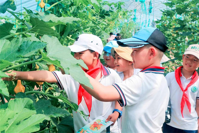 獨具魅力的彩虹西瓜、形狀各異的南瓜、五顏六色的番茄、長如手臂的辣椒、品種繁多的甜瓜綴滿枝頭,琳瑯滿目,孩子們目不暇接,身邊彌漫著沁人心脾的果香,在田野中感受萬物的拔節(jié)生長,探索奇妙的果蔬世界。置身蔬果飄香的田野中,孩子們領(lǐng)略到了自然之美,體會到生命的力量。在老師們的講解下了解到農(nóng)業(yè)科研成果對社會的貢獻和影響,更加堅定了同學(xué)們學(xué)農(nóng)愛農(nóng)的決心。