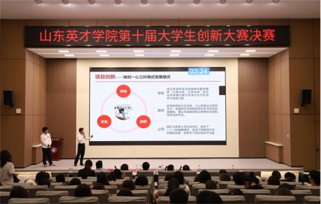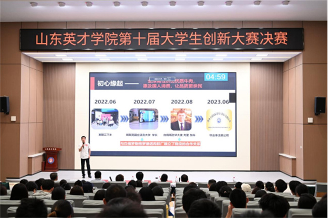 決賽開(kāi)始前,崔奎勇上臺(tái)致辭,崔奎勇對(duì)入圍決賽的團(tuán)隊(duì)表示熱烈祝賀,對(duì)為本次大賽辛勤付出的指導(dǎo)教師、學(xué)生團(tuán)隊(duì)、工作人員表示感謝。他強(qiáng)調(diào),今年4月份學(xué)校出臺(tái)了《山東英才學(xué)院關(guān)于加強(qiáng)學(xué)生創(chuàng)新創(chuàng)業(yè)素養(yǎng)培育的實(shí)施意見(jiàn)》,希望通過(guò)校院兩級(jí)的通力配合加強(qiáng)學(xué)生創(chuàng)新創(chuàng)業(yè)素養(yǎng)的培育。全校上下要落實(shí)立德樹(shù)人根本任務(wù),傳承和弘揚(yáng)紅色基因,深化“五育”與創(chuàng)新創(chuàng)業(yè)教育融合,開(kāi)啟創(chuàng)新創(chuàng)業(yè)教育改革新征程,激發(fā)青年學(xué)生創(chuàng)新創(chuàng)造熱情,打造共建共享、融通中外的國(guó)際創(chuàng)新創(chuàng)業(yè)盛會(huì),讓青春在全面建設(shè)社會(huì)主義現(xiàn)代化國(guó)家的火熱實(shí)踐中綻放絢麗之花。