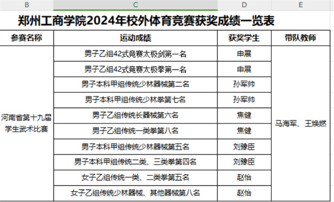 本屆比賽吸引了來自省內(nèi)80所高校、近千余名運(yùn)動員和教練員參賽,是省內(nèi)高校間級別最高、規(guī)模最大、影響力最廣的武術(shù)賽事。在校領(lǐng)導(dǎo)和學(xué)院的關(guān)懷與支持下,鄭州工商學(xué)院武術(shù)代表隊(duì)選派6名運(yùn)動員,在馬海軍、王煥燃老師的帶領(lǐng)下,分別參加了12個單項(xiàng)比賽,共獲獎十項(xiàng)。比賽中,運(yùn)動員們用頑強(qiáng)拼搏的精神、高超的技術(shù),展示了該校學(xué)子健康自信、團(tuán)結(jié)向上的陽光形象,為該校樹立了良好的口碑、贏得了贊譽(yù)。