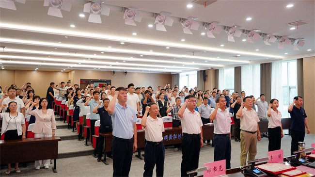 在雄壯的國歌聲中,表彰大會拉開帷幕。隨后,面對鮮紅的黨旗,在張樹嶺的領誓下,全體參會黨員聲音鏗鏘、神情莊重地重溫入黨誓詞,回顧對黨和人民的承諾,堅定黨的信仰和追求。