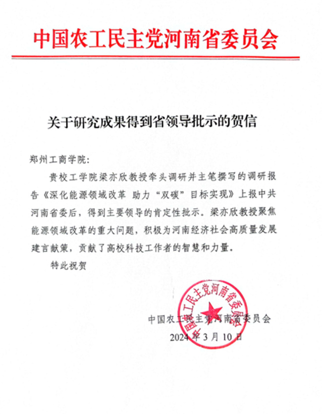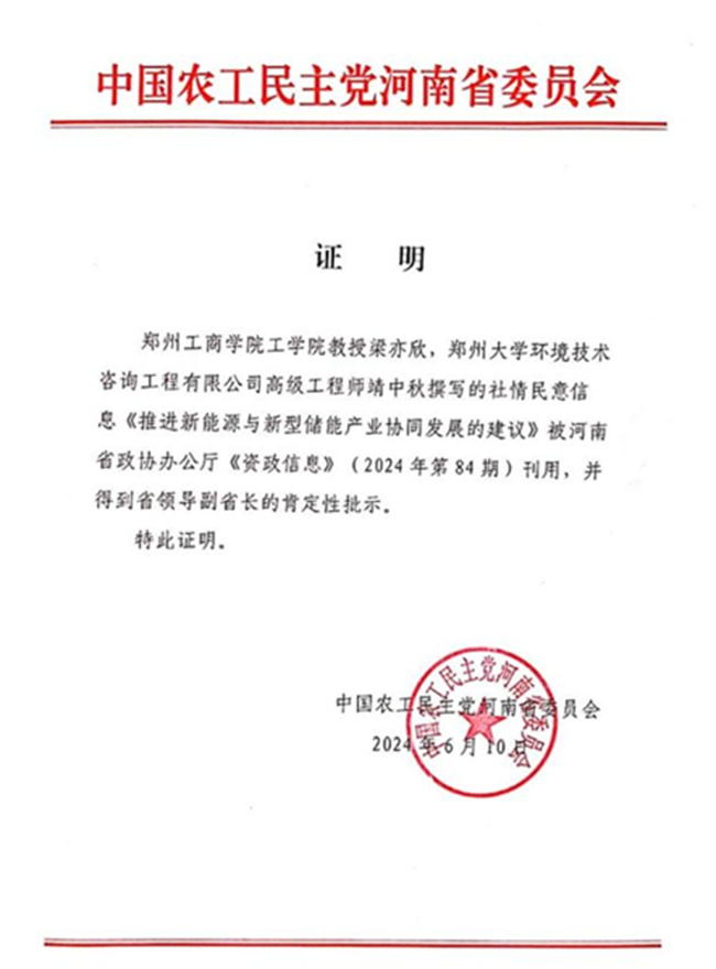 中新河南網(wǎng)7月22日電(梁亦欣) 近日,鄭州工商學院收到農(nóng)工黨河南省委會發(fā)來的賀信和證明,由該校工學院梁亦欣教授牽頭調(diào)研并主筆撰寫的調(diào)研報告《深化能源領域改革助力“雙碳”目標實現(xiàn)》上報中共河南省委后,得到主要領導的肯定性批示;其主筆撰寫的《推進新能源與新型儲能產(chǎn)業(yè)協(xié)同發(fā)展的建議》被河南省政協(xié)辦公廳《資政信息》(2024年第84期)刊用,并得到省領導的肯定性批示。
