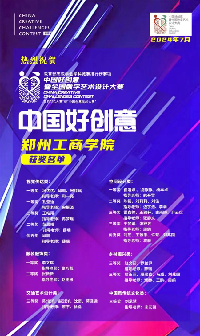 中國(guó)好創(chuàng)意暨全國(guó)數(shù)字藝術(shù)設(shè)計(jì)大賽是入選教育部中國(guó)高等教育學(xué)會(huì)發(fā)布的《全國(guó)普通高校學(xué)科競(jìng)賽排行榜》賽項(xiàng),是我國(guó)跨學(xué)科、多專(zhuān)業(yè)、影響廣泛的權(quán)威賽事。自賽訊發(fā)布以來(lái),鄭州工商學(xué)院藝術(shù)學(xué)院高度重視此項(xiàng)競(jìng)賽,秉承“以賽促學(xué)、以賽促教”的育人理念,統(tǒng)籌安排、廣泛宣傳動(dòng)員學(xué)生參賽,以專(zhuān)業(yè)競(jìng)賽為牽引,著力提升學(xué)生創(chuàng)新能力。