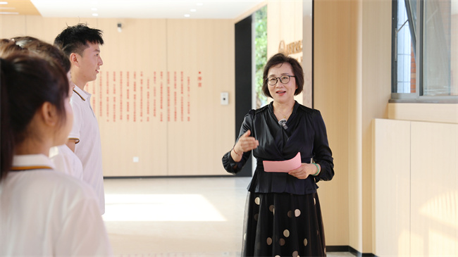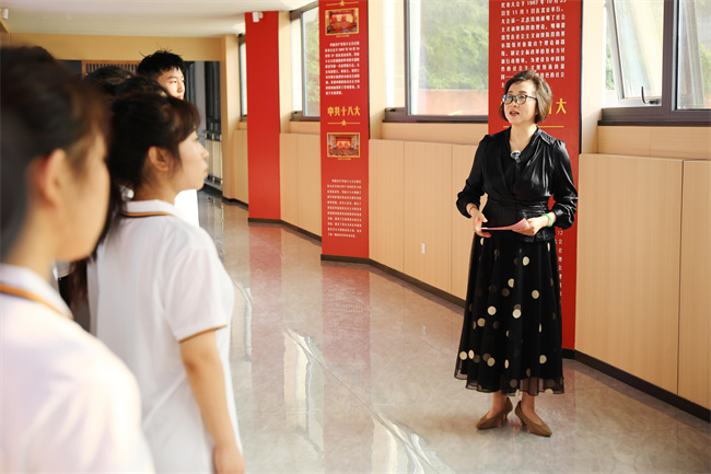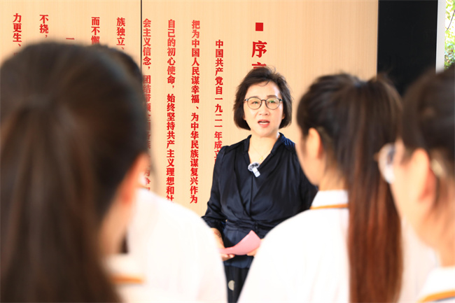 在新建成的思政文化長廊,沈潔霞以現(xiàn)場教學(xué)的形式,圍繞“重溫黨的百年奮斗歷程,為中國式現(xiàn)代化挺膺擔(dān)當(dāng)”主題,為學(xué)生講授“開學(xué)第一課”。沈潔霞帶領(lǐng)同學(xué)們回顧了中國共產(chǎn)黨從一大到二十大的光輝歷史,她表示,中國共產(chǎn)黨自1921年成立以來,始終堅守為中國人民謀幸福,為中華民族謀復(fù)興的初心使命。始終堅持共產(chǎn)主義理想和社會主義信念,團(tuán)結(jié)帶領(lǐng)全國各族人民為爭取民族獨立、人民解放和實現(xiàn)國家富強(qiáng)、人民幸福而不懈奮斗。黨領(lǐng)導(dǎo)人民創(chuàng)造了新民主主義革命、社會主義革命和建設(shè)、改革開放和社會主義現(xiàn)代化建設(shè)、新時代中國特色社會主義的偉大成就。黨和人民百年奮斗,書寫了中華民族幾千年歷史上最恢宏的史詩。