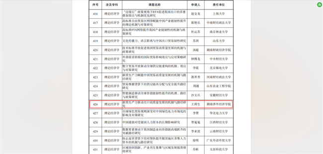 中新河南網9月18日電 2024年9月14日,全國哲學社會科學工作辦公室發(fā)布了《關于2024年國家社會科學基金年度項目立項名單的公示》。湖南涉外經濟學院商學院王濤生教授主持的《新質生產力驅動出口高質量發(fā)展的機制與路徑研究》項目脫穎而出,成功獲批立項,該校也成為2024年度湖南省內唯一一所獲批此類項目的民辦本科院校。至此,改校已累計獲批國家社會科學基金項目4項。