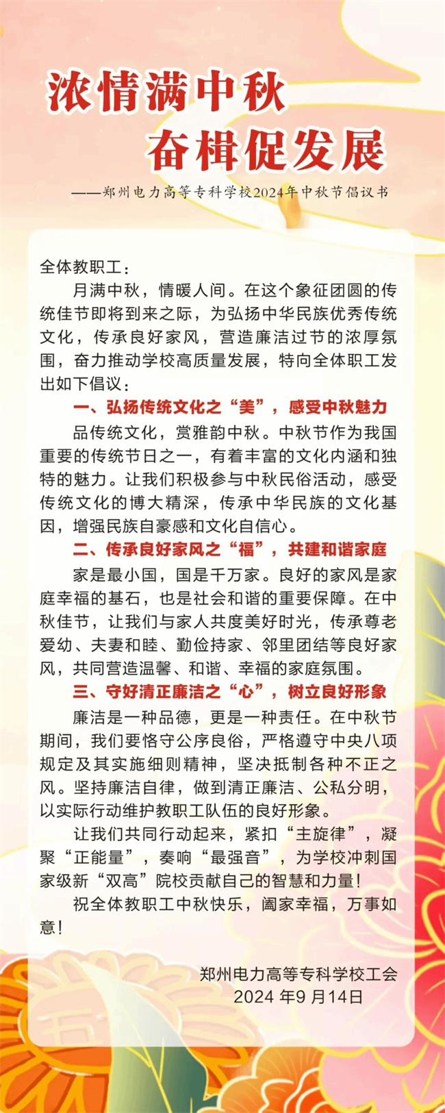 鄭州電力高等專科學(xué)校工會(huì)還向全體教職工發(fā)布了《鄭州電力高等?凄嵵蓦娏Ω叩葘?茖W(xué)校2024年中秋節(jié)倡議書》。號(hào)召全體教職工弘揚(yáng)傳統(tǒng)文化之“美”,感受中秋魅力;傳承良好家風(fēng)之“福”,共建和諧家庭;守好清正廉潔之“心”,樹立良好形象,共同行動(dòng),緊扣“主旋律”,凝聚“正能量”,奏響“最強(qiáng)音”,為學(xué)校沖刺國家級(jí)新“雙高”院校貢獻(xiàn)自己的智慧和力量。