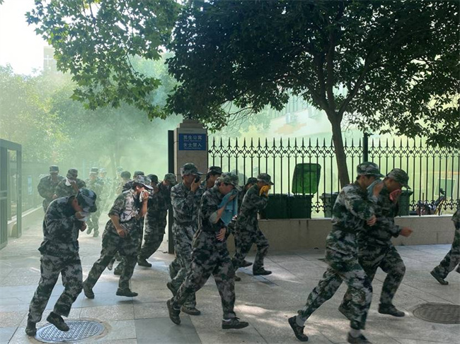 軍訓(xùn)教官在學生宿舍樓投放消防演習發(fā)煙罐模擬火情,一時濃煙四起。隨后消防警報聲響起,本次應(yīng)急疏散逃生演練也拉開了序幕,同學們拿起濕毛巾,捂住口鼻,彎腰,在充滿煙霧的緊張環(huán)境中按照消防通道路線,有序、快速向指定地點進行疏散。到達集合地點后,教官們迅速清點班級人數(shù),確保全部學生都及時撤離、無掉隊。