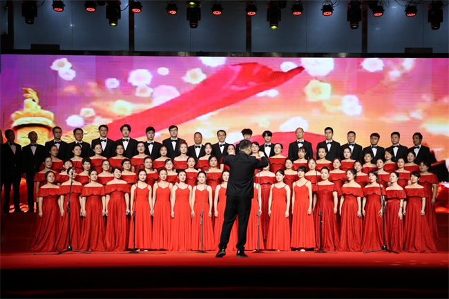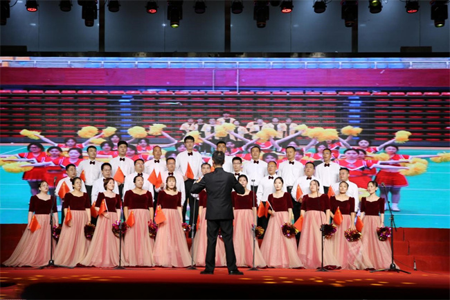 當(dāng)晚,大學(xué)生活動中心燈光璀璨、氣氛喜慶。比賽在機關(guān)合唱二隊與繼續(xù)教育學(xué)院合唱隊帶來的歌曲《東方紅》中拉開帷幕。比賽中,全校11支參賽隊以昂揚的精神、飽滿的熱情、恢弘的氣勢、整齊的隊列先后登場!稕]有共產(chǎn)黨就沒有新中國》《我和我的祖國》《今天是你的生日》《祖國不會忘記》《我們走在大路上》《團結(jié)就是力量》《愛我中華》《保衛(wèi)黃河》等一首首歌曲被飽含深情地演繹,時而昂揚激越、時而低沉傾訴、時而鏗鏘有力,唱出了鄭職院教職工對祖國的無限熱愛,唱出了一心向黨砥礪前行的熾熱情懷,抒發(fā)了鄭職院教職工為黨育人、為國育才的堅定決心和向著國家一流高水平高職院校闊步前行的堅定信心。