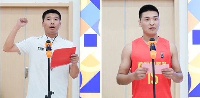運動員劉雨松、裁判員朱瑞坤分別代表參加第十二屆“迎新杯”籃球聯(lián)賽的運動員、裁判員宣誓。