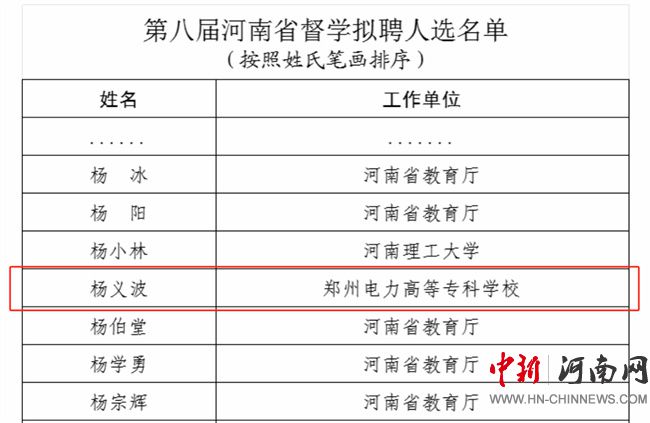 中新河南網(wǎng)11月9日電(姚夢偉) 日前,河南省教育廳公布了第八屆河南省督學(xué)擬聘人選名單,鄭州電力高等?茖W(xué)校黨委書記楊義波教授名列其中。
