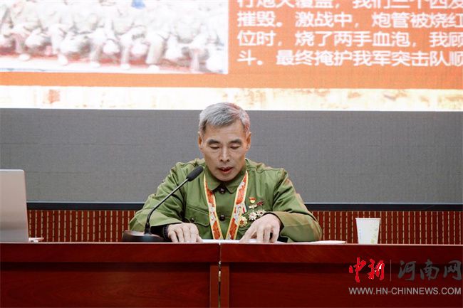 一等戰(zhàn)功功臣郭顏虎,身穿軍裝、胸掛勛章走上講臺,以《英雄屬于南疆犧牲的烈士》為題,從老兵視角出發(fā),用質樸語言講述了軍人不怕犧牲、勇于擔當、無私奉獻的英雄事跡。