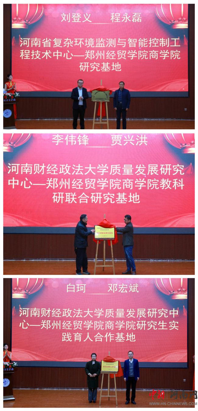 隨后,河南省復(fù)雜環(huán)境監(jiān)測與智能控制工程技術(shù)中心—鄭州經(jīng)貿(mào)學(xué)院商學(xué)院研究基地、河南財經(jīng)政法大學(xué)質(zhì)量發(fā)展研究中心—鄭州經(jīng)貿(mào)學(xué)院商學(xué)院教科研聯(lián)合研究基地、河南財經(jīng)政法大學(xué)質(zhì)量發(fā)展研究中心—鄭州經(jīng)貿(mào)學(xué)院商學(xué)院研究生實踐育人合作基地順利揭牌。