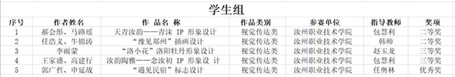 其中,郝會(huì)彤、馬路瑤共同完成的《天青汝韻——青沫 IP 形象設(shè)計(jì)》,任浩義、牛錦濤共同完成的《“豫見(jiàn)鄭州”插畫(huà)設(shè)計(jì)》分別獲得學(xué)生組二等獎(jiǎng);李雨蒙的《“洛小花”洛陽(yáng)牡丹形象設(shè)計(jì)》,王家盛、高建行共同完成的《汝韻陶雅——念汝初 IP 形象設(shè)計(jì)》分別獲得學(xué)生組三等獎(jiǎng);郭廣哲、申延戰(zhàn)共同完成的《“遇見(jiàn)民宿”標(biāo)志設(shè)計(jì)》榮獲學(xué)生組優(yōu)秀獎(jiǎng);趙玉龍的《“梨園夢(mèng)華”豫劇 IP 形象設(shè)計(jì)》獲教師組優(yōu)秀獎(jiǎng)。