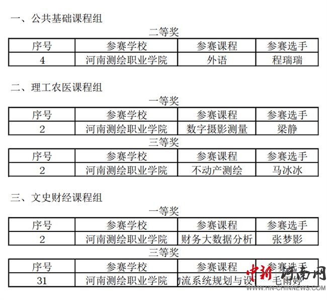 中新河南網(wǎng)12月26日電(陳賀) 12月24日,河南省教育廳發(fā)布關(guān)于2024年河南省高等職業(yè)教育課堂教學(xué)創(chuàng)新大賽的擬獲獎(jiǎng)名單。河南測(cè)繪職業(yè)學(xué)院參賽教師榮獲一等獎(jiǎng)2項(xiàng)、二等獎(jiǎng)1項(xiàng)、三等獎(jiǎng)2項(xiàng),實(shí)現(xiàn)了新的突破。