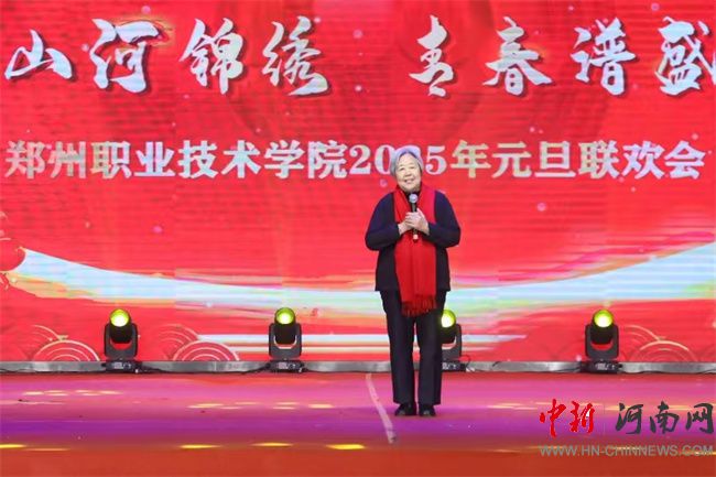 鄭州職業(yè)技術(shù)學(xué)院原副校長周慧玲在學(xué)校元旦聯(lián)歡會現(xiàn)場為全校師生送上祝福并表演詩朗誦《沁園春·長沙》