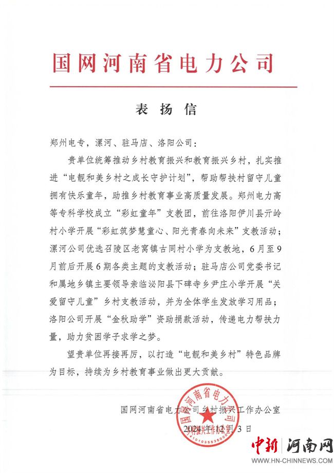 中新河南網(wǎng)1月3日電(王宣衡) 近日,國網(wǎng)河南省電力公司通報(bào)表揚(yáng)鄭州電力高等?茖W(xué)校成立“彩虹童年”支教團(tuán),前往洛陽伊川縣亓嶺村小學(xué)開展“彩虹筑夢(mèng)慧童心、陽光青春向未來”支教活動(dòng),對(duì)鄭州電力高等?茖W(xué)校校地結(jié)對(duì)幫扶工作取得的優(yōu)異成績給予充分肯定;對(duì)鄭州電力高等專科學(xué)校在助力伊川縣鄉(xiāng)村振興過程中,展現(xiàn)出國家電網(wǎng)大國重器責(zé)任擔(dān)當(dāng)?shù)那閼押蛧译娋W(wǎng)人特別能吃苦、特別能戰(zhàn)斗、特別能奉獻(xiàn)的企業(yè)精神給予高度評(píng)價(jià)。