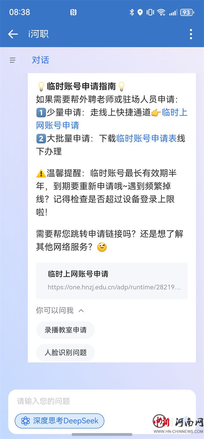 中新河南網(wǎng)3月6日電(劉攀) 3月4日,河南職業(yè)技術(shù)學(xué)院校園AI助理“i河職”正式上線,并同步接入學(xué)校網(wǎng)站信息門戶及企業(yè)微信平臺,可為師生提供全天候、多維度的校園服務(wù),標(biāo)志著學(xué)校信息化建設(shè)邁出重要一步。