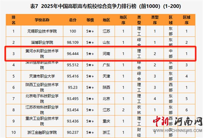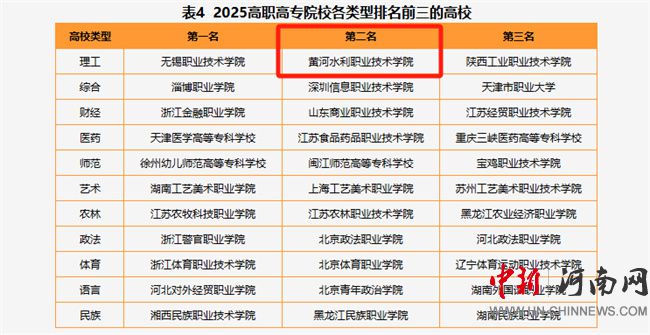 黃河水院在“金平果”2025年中國高職高專院校綜合競爭力排行榜中位居中部第一