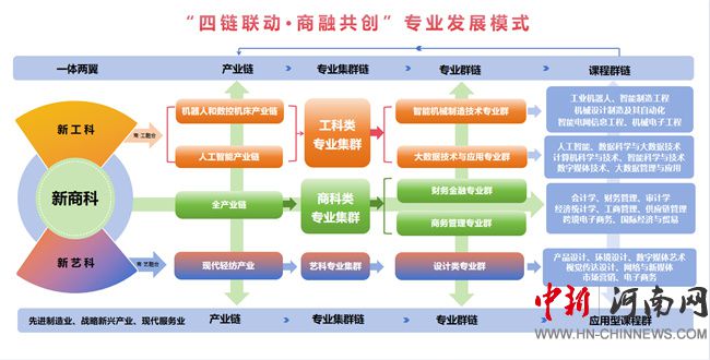 依托河南省和鄭州市重點產(chǎn)業(yè)鏈,面向先進(jìn)制造業(yè)、戰(zhàn)略新興產(chǎn)業(yè)、現(xiàn)代服務(wù)業(yè)三大產(chǎn)業(yè),打造工科類、商科類、藝科類三大專業(yè)集群,形成與區(qū)域產(chǎn)業(yè)高度匹配的智能機(jī)械制造技術(shù)專業(yè)群、大數(shù)據(jù)技術(shù)與應(yīng)用專業(yè)群、財務(wù)金融專業(yè)群、商務(wù)管理專業(yè)群、設(shè)計類專業(yè)群六大專業(yè)群。
