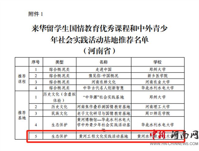 中新河南網(wǎng)5月7日電 近日,中國教育國際交流協(xié)會公布首批“來華留學(xué)生國情教育優(yōu)秀課程和中外青少年社會實踐活動基地”推薦名單,黃河水利職業(yè)技術(shù)大學(xué)申報的“黃河工程文化實踐活動基地”(生態(tài)保護類)成果入選。此次評選中,河南省共入選課程4門、基地5個,黃河水利職業(yè)技術(shù)大學(xué)是全省職業(yè)教育領(lǐng)域唯一入選單位。