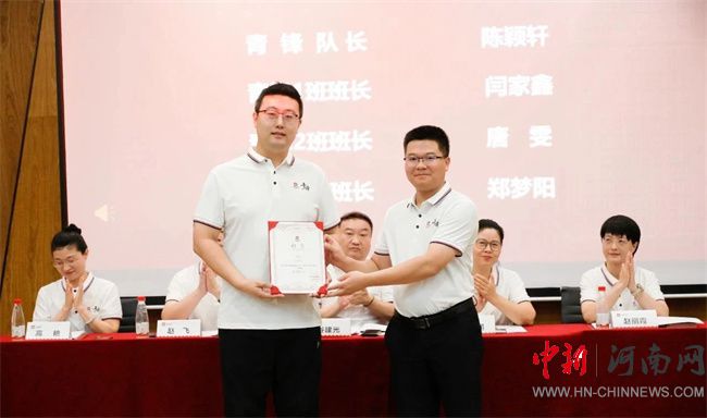 集團(tuán)華信創(chuàng)智學(xué)堂校長(zhǎng)李德彬?yàn)?ldquo;青鋒”隊(duì)長(zhǎng)陳穎軒頒發(fā)聘書。