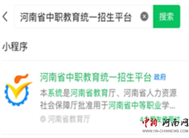 1. 打開手機微信,搜索小程序“河南省中職教育統(tǒng)一招生平臺”進入;