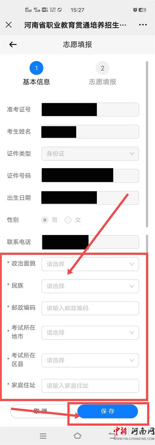 3.進(jìn)入“志愿填報(bào)”頁(yè)面之后,填寫(xiě)考生的“政治面貌、民族、郵政編碼、考試所在地市、考試所在區(qū)縣、家庭住址”,然后點(diǎn)擊“保存”按鈕,接下來(lái)點(diǎn)擊“下一步”按鈕,進(jìn)行志愿填報(bào)。如下圖: