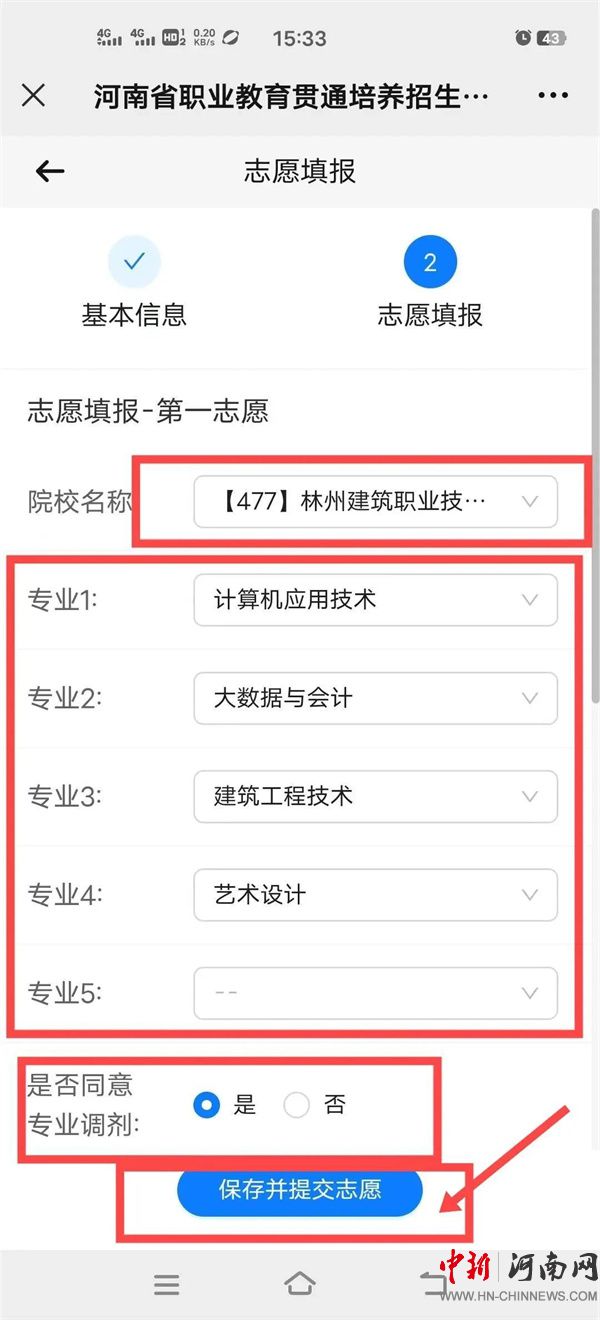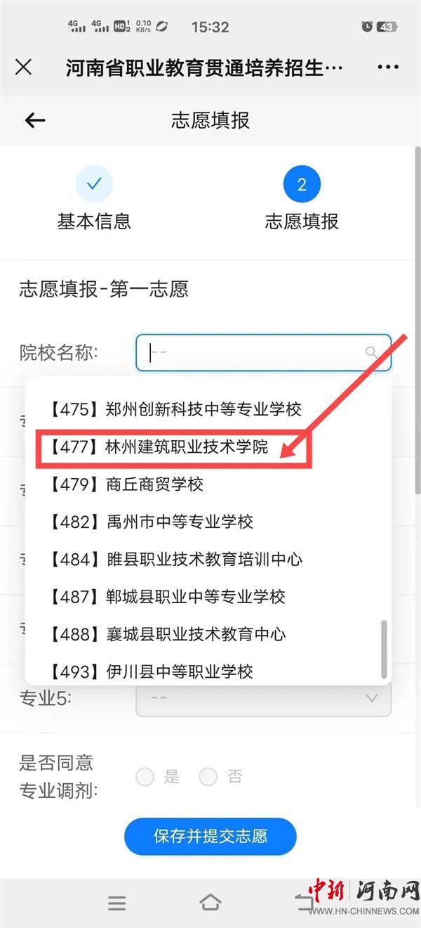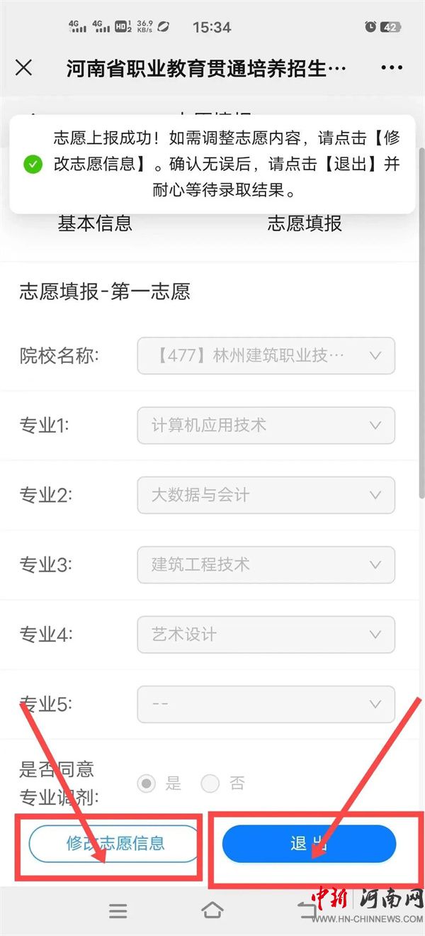 4.考生可填報(bào)兩個(gè)志愿,實(shí)行順序志愿投檔,每個(gè)志愿填報(bào)1所院校,每所院校填報(bào)1至5個(gè)專(zhuān)業(yè),并需確認(rèn)是否同意所報(bào)院校專(zhuān)業(yè)間調(diào)劑(填報(bào)學(xué)校志愿的考生,搜索院校名稱(chēng)“【477】林州建筑職業(yè)技術(shù)學(xué)院”),然后點(diǎn)擊“保存并提交志愿”按鈕,最后系統(tǒng)顯示志愿上報(bào)成功。如需調(diào)整志愿內(nèi)容,請(qǐng)點(diǎn)擊“修改志愿信息”。確認(rèn)無(wú)誤后,請(qǐng)點(diǎn)擊【退出】并耐心等待錄取結(jié)果。如下圖: