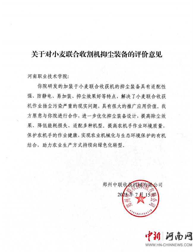 圖11 鄭州中聯(lián)收獲機(jī)械有限公司《關(guān)于對(duì)小麥聯(lián)合收割機(jī)抑塵裝備的評(píng)價(jià)意見》