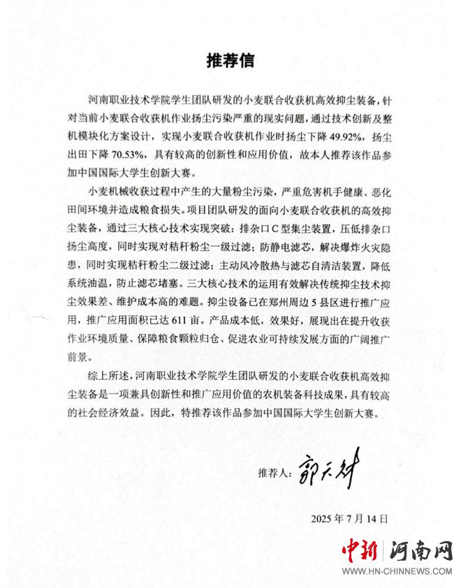 團(tuán)隊(duì)與鄭州樸華科技有限公司、鄭州中聯(lián)收獲機(jī)械有限公司協(xié)作推進(jìn)技術(shù)轉(zhuǎn)化,通過輕量化設(shè)計(jì)、模塊化改造,使設(shè)備適配多種機(jī)型。在登封、新鄭等5縣區(qū)的611畝麥田推廣中,農(nóng)機(jī)手反饋“視野清晰了,呼吸順暢了”,鄭州中聯(lián)收獲機(jī)械有限公司評(píng)價(jià)對(duì)本設(shè)備做出評(píng)價(jià)意見:“該設(shè)備具有防靜電、自清潔、易裝配等優(yōu)點(diǎn),具有重大推廣價(jià)值”。