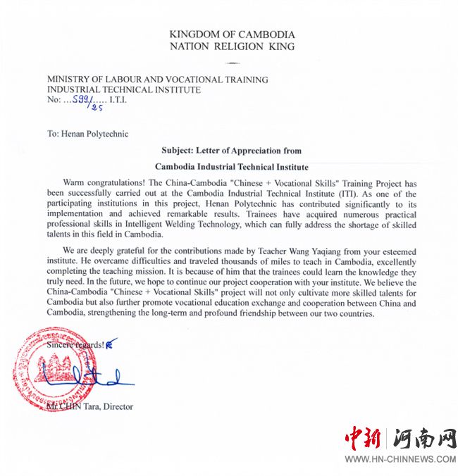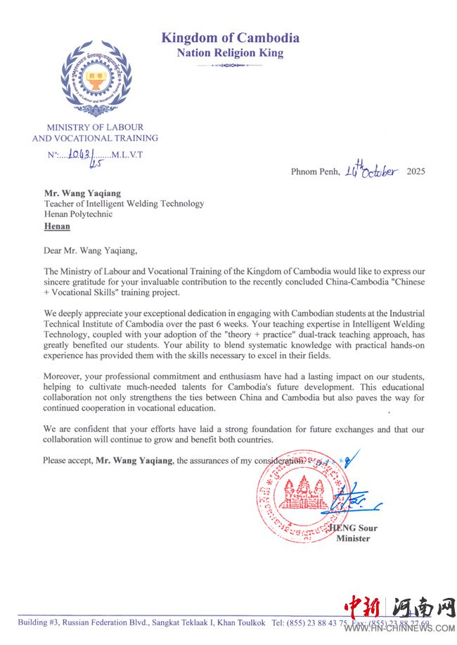 中新河南網(wǎng)10月29日電(王亞強(qiáng)、韓瑞) 近日,河南職業(yè)技術(shù)學(xué)院收到來自柬埔寨勞工與職業(yè)培訓(xùn)部和工業(yè)技術(shù)學(xué)院發(fā)來的兩封感謝信。信中寫道:感謝你們?yōu)橹袊?mdash;柬埔寨“中文+職業(yè)技能”項(xiàng)目所做的貢獻(xiàn),王亞強(qiáng)老師傾心指導(dǎo)柬埔寨學(xué)員的敬業(yè)精神令人感佩,您憑借智能焊接技術(shù)領(lǐng)域的專業(yè)造詣,采用“理論+實(shí)踐”雙軌并行的教學(xué)模式,使學(xué)員們受益匪淺……