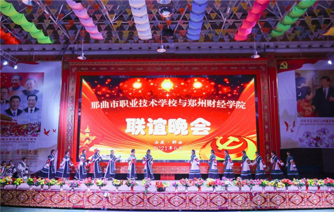 交流期間,那曲職校藝術團還準備了精彩的聯(lián)誼晚會,藝術團師生載歌載舞,熱情歡迎鄭州財經(jīng)學院援藏代表團。婉轉(zhuǎn)悠揚的歌聲,美輪美奐的舞蹈,盡展藏區(qū)同胞的熱情和民族風情,為代表團成員留下深刻的印象。