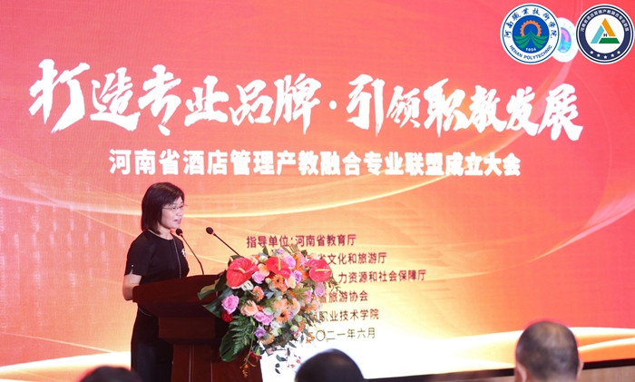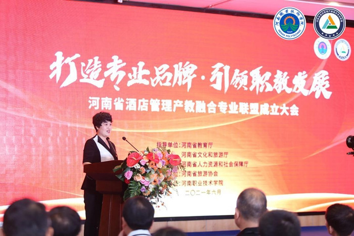 李桂貞介紹了學(xué);厩闆r,回顧了學(xué)校近年來在產(chǎn)教融合、校企合作工作中所取得的成績。她表示,聯(lián)盟的成立將為加快推進(jìn)省文旅產(chǎn)業(yè)轉(zhuǎn)型升級(jí),探索新時(shí)期酒店管理專業(yè)人才培養(yǎng)新機(jī)制,推進(jìn)我省酒店管理專業(yè)高水平、高質(zhì)量發(fā)展提供有力保障。作為聯(lián)盟的發(fā)起單位,學(xué)校將與聯(lián)盟成員一起,擁護(hù)聯(lián)盟章程,依托聯(lián)盟平臺(tái),凝聚各方智慧,秉持“自愿參加、資源共享、優(yōu)勢(shì)互補(bǔ)、合作共贏”的原則,堅(jiān)持“合作辦學(xué)、協(xié)同育人、合作研究、合作發(fā)展”的工作思路,搭建校、政、企、行深度交流合作平臺(tái),促進(jìn)聯(lián)盟成員之間資源共享、互利共贏和協(xié)同創(chuàng)新。她希望,聯(lián)盟成員互通互鑒,攜手共進(jìn),共同推進(jìn)我省酒店管理專業(yè)產(chǎn)教融合高質(zhì)量發(fā)展,努力培養(yǎng)酒店管理類卓越人才,為國家經(jīng)濟(jì)發(fā)展和中原更加出彩作出更大貢獻(xiàn)。