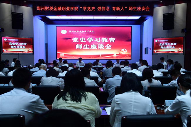 與該校師生代表互動交流后,黃卿部長發(fā)表講話。他指出,時值建黨百年之際,能夠來到鄭州財稅金融職業(yè)學(xué)院參加黨史學(xué)習(xí)教育座談會,交流、學(xué)習(xí)、體會,時機(jī)合適且意義重大。習(xí)近平總書記“七一”重要講話,高屋建瓴、視野宏闊、精辟深刻、震撼人心,全面回顧我們黨篳路藍(lán)縷、櫛風(fēng)沐雨的百年歷史進(jìn)程,系統(tǒng)總結(jié)我們黨奠基立業(yè)、鑄就輝煌的百年奮斗成就,深刻闡明我們黨獨(dú)立自主、實(shí)踐創(chuàng)造的百年發(fā)展規(guī)律,科學(xué)展望我們黨開拓進(jìn)取、走向未來的百年宏偉藍(lán)圖,是一篇充滿真理力量的馬克思主義綱領(lǐng)性文獻(xiàn),是馬克思主義中國化時代化的最新成果。他強(qiáng)調(diào),廣大師生要把 “七一”重要講話作為黨史學(xué)習(xí)教育的重要內(nèi)容,認(rèn)真組織學(xué)習(xí),領(lǐng)會精神實(shí)質(zhì),堅定信心決心,圍繞實(shí)現(xiàn)中華民族偉大復(fù)興這一主題,貫穿弘揚(yáng)偉大建黨精神,以史為鑒、開創(chuàng)未來,堅持“九個必須”,推進(jìn)鄭州國家中心城市現(xiàn)代化建設(shè)不斷取得新突破、開創(chuàng)新局面。