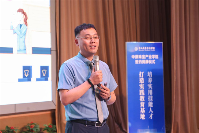 鄭州市珠寶玉石首飾行業(yè)協(xié)會(huì)產(chǎn)教融合專(zhuān)業(yè)委員會(huì)主任、河南省中原珠寶集團(tuán)有限公司副總裁韓國(guó)宏主持“珠寶的魅力——首屆鄭職-中原珠寶產(chǎn)業(yè)沙龍”