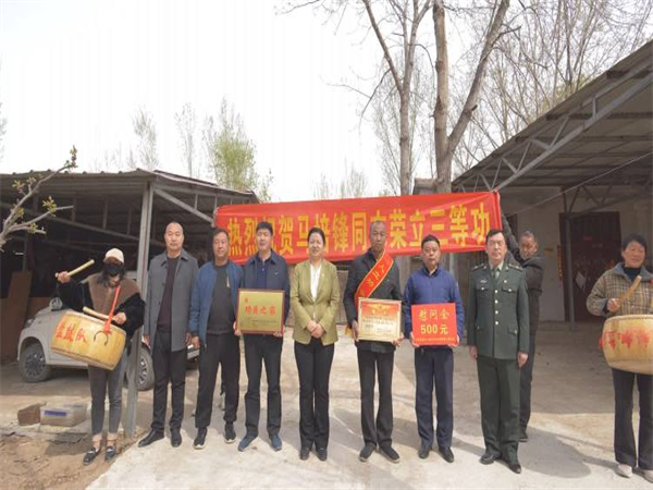 中新河南網(wǎng)3月16日電:一張喜報(bào)、全家光榮,立功受獎(jiǎng)是軍人榮譽(yù)的象征。3月15日上午,在喜慶的鑼鼓聲中,開封市示范區(qū)杏花營農(nóng)場黨委書記郝敏、副書記孫紅光、正科級干部王志國及退役軍人服務(wù)站、武裝部全體工作人員來到杏花營農(nóng)場秫米店社區(qū),為榮立三等功的現(xiàn)役軍人家屬送立功喜報(bào)和慰問金,表達(dá)黨和政府對立功軍人家屬的關(guān)懷和問候。