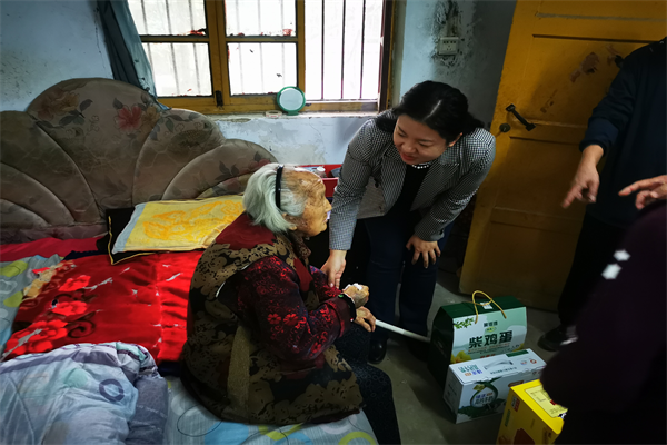 杏花營(yíng)農(nóng)場(chǎng)黨委書記郝敏與農(nóng)場(chǎng)正科級(jí)干部王志國(guó)及民政所所長(zhǎng)一起來(lái)到老人家中,為老人帶去了雞蛋、牛奶、食用油等生活物品,把黨的關(guān)心關(guān)懷送至家中。每到一戶都耐心與其本人及子女交談,與老人拉家常,了解高齡老人的健康狀況,有無(wú)生活需求等方面的困難,傾聽他們的心聲,幫助他們解決實(shí)際困難,并叮囑其家人要細(xì)心照顧,讓老人安享晚年。在秫米店社區(qū)百歲老人王李氏家中,看到農(nóng)場(chǎng)干部來(lái)到自己家里,老人高興的合不攏嘴。“沒(méi)想到我這么大年紀(jì)了,咱農(nóng)場(chǎng)的干部還牽掛著我,現(xiàn)在兒女孝順,吃穿不愁,真是越活越好,感謝黨委政府!”老人滿臉笑容的說(shuō)到。