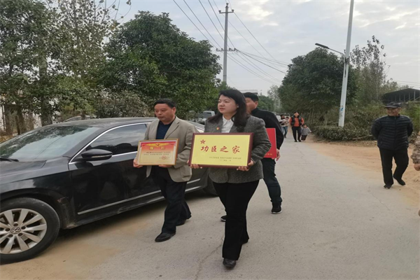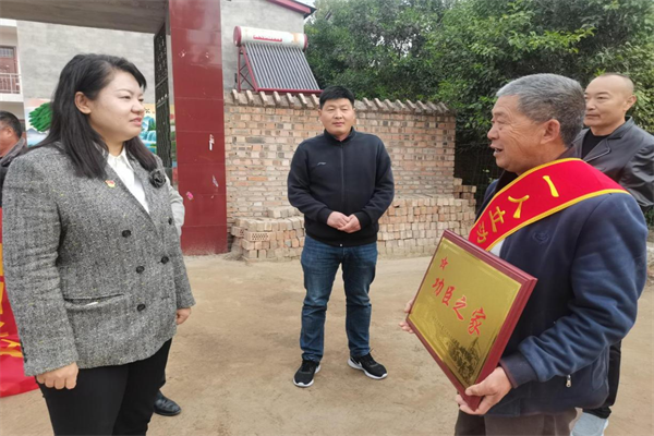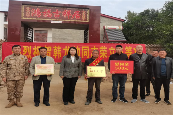 11月8日上午,杏花營農(nóng)場黨委書記郝敏一行來到汴河堤社區(qū),為在部隊榮獲三等功的現(xiàn)役軍人韓龍帥的家屬送來三等功立功喜報和慰問金。(郭克慧)