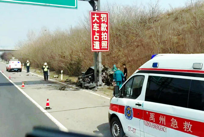 到達(dá)現(xiàn)場后,消防救援人員發(fā)現(xiàn):一輛轎車撞向高速公路的路牌支柱,車輛整體旋轉(zhuǎn)180度,車頭部位嚴(yán)重?fù)p毀,駕駛室變形,駕駛員雙腿被卡在儀表臺(tái)下方。經(jīng)醫(yī)護(hù)人員簡單檢查,被困駕駛員意識(shí)清醒,暫無生命危險(xiǎn)。