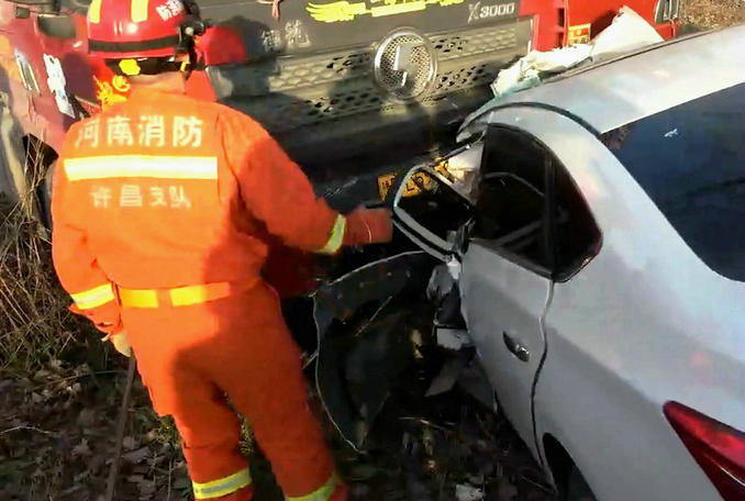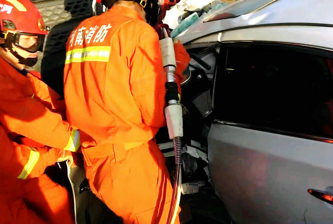 河南襄城:半掛車避讓三輪車撞上轎車 消防隊員立即趕赴破拆救援