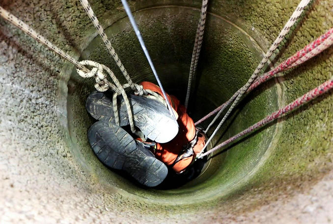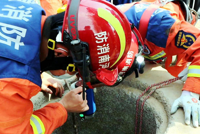 考慮到狹窄的深井內(nèi)缺氧,現(xiàn)場(chǎng)的消防救援人員首先用空氣呼吸器氣瓶向井內(nèi)供氧。隨后,由一名體型較小的消防員攜帶繩索及腰帶采取“倒掛金鉤”的方式垂直下降深井內(nèi)營(yíng)救。