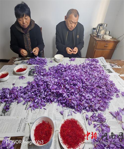 2024年秋播開始后,劉永濤滿懷希望地開啟了他的“植金”旅程。為確保萬無一失,他在田間蹲了整整2個月,記錄溫度濕度,調(diào)整土壤酸堿度。從幼苗破土,到保水施肥排澇,今年11月,這片習慣了玉米小麥的土地,第一朵藏紅花如期在晨霧中綻放,看著劉永濤從花中取出那幾根紅色花絲,好多村民依然用質(zhì)疑的口氣問:“就這三根絲,真能這么值錢,真比種糧食收益高?”