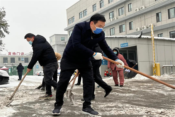 為方便患者就診及職工出行,1月22日早上,在開封市中心醫(yī)院領(lǐng)導(dǎo)的帶領(lǐng)下,院長辦公室、黨委辦公室、醫(yī)務(wù)部、科教科、宣傳科、總務(wù)科、保衛(wèi)科、設(shè)備科、服務(wù)中心及一線臨床等多名人員組成臨時“掃雪隊”,冒著嚴寒,抓緊清掃鏟除院內(nèi)積雪,以確保病人收治和正常治療,保證“綠色生命通道”的暢通。