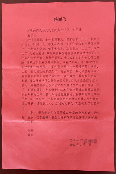 中新河南網(wǎng)3月8日電:陽春三月,春意盎然,在3.8婦女節(jié)當(dāng)天,尉氏縣人民法院收到了一份特別的禮物:當(dāng)事人的一面上書“懷愛民之心,辦利民之事”十個金燦燦大字的錦旗和一封飽含對尉氏法院認(rèn)可的感謝信。