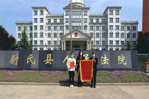 4月20日上午,在尉氏法院門前,當事人手持一面寫有“最美調解排民憂、高效為民促和諧”錦旗向尉氏法院表達感謝之情。
