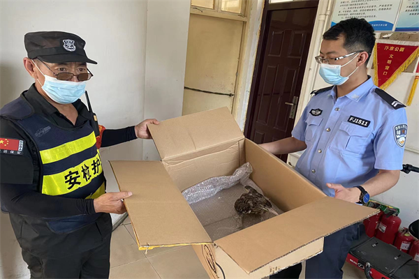 中新河南網(wǎng)6月9日電:2022年6月7日上午11時許,開封市龍亭公安分局北道門派出所民警羅乾坤接到群眾報警救助,民警到達本轄區(qū)鐵塔西街天下城小區(qū)后得知,報警人劉松寧為天下城業(yè)主,在當天上午十點多走到小區(qū)北門城墻公園時,發(fā)現(xiàn)地上一只不常見的鳥,不會飛,尖長嘴,咖啡色的羽毛,體型是麻雀的十倍還大,看著像幼鳥,狀態(tài)不是很好,就帶到家中放到紙箱里并報警求助。