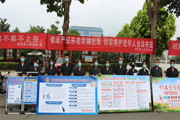為了進一步推動全國整治養(yǎng)老詐騙專項行動,提升老年人的識騙防騙能力,守護好老人手中的“錢袋子”,2022年7月4日,開封市尉氏縣人民法院刑事審判庭全體干警來到人民廣場,通過懸掛橫幅、發(fā)放宣傳頁、布置展板面等方式開展了以“預防養(yǎng)老詐騙,切實維護好老人權益”為主題的宣傳活動。