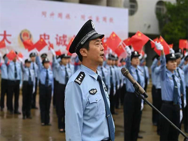 上午9時,升旗儀式正式開始。來自市局各分局、局直各單位主要負(fù)責(zé)同志、英模代表和民警代表100余人在升旗臺前整裝列隊,肅穆而立。在指揮員清脆洪亮的口令下,國旗護(hù)衛(wèi)隊邁著鏗鏘有力的步伐,護(hù)衛(wèi)著鮮艷的五星紅旗來到升旗臺前。伴隨著雄壯激昂、催人奮進(jìn)的《義勇軍進(jìn)行曲》,鮮艷的五星紅旗冉冉升起,大家莊嚴(yán)肅立、警容嚴(yán)整,向國旗敬禮致敬,表達(dá)對偉大祖國的無限熱愛,對黨、對人民、對公安事業(yè)的無限忠誠。隨后舉行的“國旗下的宣誓”活動,在副市長、市公安局黨委書記、局長王延青領(lǐng)誓下,全體人員重溫入警誓詞,共同回顧入警時的莊嚴(yán)承諾和堅定決心,鏗鏘有力的誓言在活動現(xiàn)場上空久久回蕩。