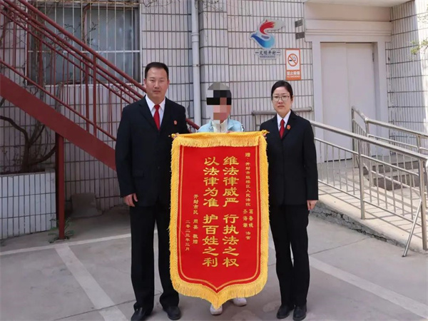 中新河南網(wǎng)4月1日電:3月31日,申請人周某來到開封市鼓樓區(qū)人民法院,滿面笑容,將一面寫著“維法律威嚴(yán),行執(zhí)法之權(quán),以法律為準(zhǔn),護百姓之利”的錦旗送到執(zhí)行干警葛魯娥、齊海潮手中,并連連表示感謝:“衷心感謝法官的不懈努力,解決了我的心病。”